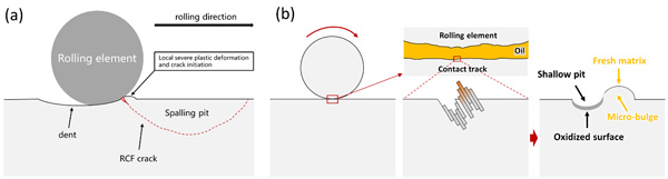 圖3.(a)凹痕誘發(fā)表面裂紋萌生機制;(b)超高循環(huán)周次下表面微塑性變形機制