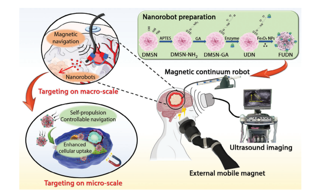 腦膠質(zhì)瘤是嚴重危害人類健康的惡性腫瘤,患者中位生存期不到15個月,目前臨床采用的治療手段包括手術(shù)治療、放化療和靶向治療等。其中,靶向治療面臨著由于血腦屏障的阻隔使得大部分藥物分子不能夠進入腦組織的難題。中國科學院沈陽自動化研究所科研團隊與中國醫(yī)科大學附屬盛京醫(yī)院合作,研制了一套子母式微納米機器人系統(tǒng),可經(jīng)顱骨微創(chuàng)通道進入顱內(nèi),越過血腦屏障抵達膠質(zhì)瘤部位,將藥物精準遞送到膠質(zhì)瘤病灶。該研究以Dual-Responsive Nanorobot-Based Marsupial Robotic System for Intracranial Cross-Scale Targeting Drug Delivery為題,發(fā)表在最新一期材料領(lǐng)域國際頂刊《先進材料》(影響因子29.4)。