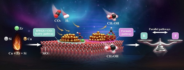近日,中國科學院大連化學物理研究所氫能與先進材料研究部碳資源小分子與氫能利用研究組研究員孫劍、副研究員俞佳楓團隊與德國卡爾斯魯厄理工學院Anna Zimina博士等合作,利用火焰噴射裂解法(FSP)構建了錨定在SiO2上的單位點Zr物種,該Cu/Zr-SiO2催化劑在CO2加氫制甲醇反應中遵循“RWGS-CO hydro”路徑,與傳統(tǒng)的ZrO2納米顆粒上的“甲酸鹽”路徑并行存在,打破了單一反應路徑上的動力學限制,所形成的雙通道反應路徑是高效合成甲醇的關鍵。