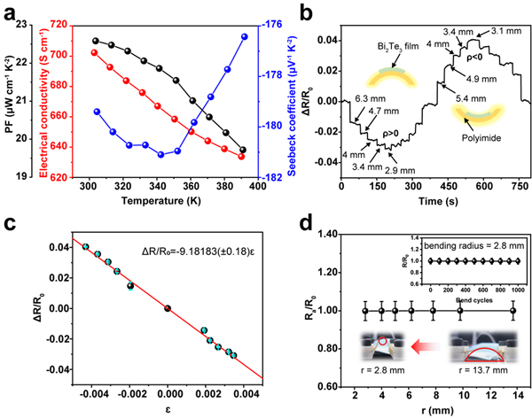 圖1. 設(shè)計(jì)制備的Bi2Te3/PI薄膜熱電、壓阻及柔性性能測(cè)試結(jié)果