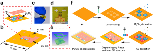 柔性溫度-壓力雙參數(shù)傳感器廣泛應(yīng)用于人體健康監(jiān)測(cè)和智能機(jī)器人傳感等領(lǐng)域,因而受到了廣泛關(guān)注。然而,目前柔性溫度-壓力傳感器基本都采用兩種獨(dú)立的傳感材料實(shí)現(xiàn)雙參數(shù)傳感功能,這不僅提高了傳感器的設(shè)計(jì)-集成難度,也增加了制造成本。因此,研發(fā)具有多功能一體化的先進(jìn)傳感材料成為本領(lǐng)域的研究重點(diǎn)和難點(diǎn)問題。碲化鉍是一種能將熱能直接轉(zhuǎn)換為電能的半導(dǎo)體材料,其產(chǎn)生的電壓與施加在材料兩端的溫差成正比關(guān)系,可用于溫度傳感;同時(shí),該類材料在受到應(yīng)力作用時(shí),帶隙會(huì)發(fā)生明顯改變,表現(xiàn)出壓阻效應(yīng),從而還可以實(shí)現(xiàn)壓力傳感。但碲化鉍半導(dǎo)體具有本征的剛性和脆性,力學(xué)和加工性能較差,難以彎曲變形、精密加工和高密度集成器件。