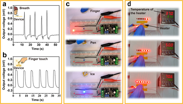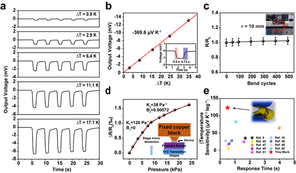 圖3. 傳感器溫度-壓力傳感性能及柔性性能測(cè)試