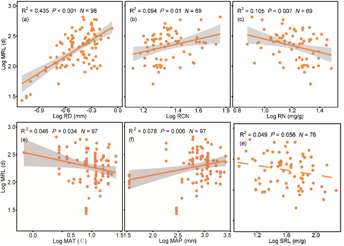 盡管吸收根(1-3級根)的生物量較低(僅占根系生物量的4%左右),卻主導(dǎo)著整株樹木根系的產(chǎn)量和周轉(zhuǎn)。通過整合全球其它站點(diǎn)利用微根管技術(shù)監(jiān)測吸收根的數(shù)據(jù),發(fā)現(xiàn)全球森林樹木吸收根的平均壽命是226天,其中最短的是27天,最長的是656天。細(xì)根壽命的最佳預(yù)測模型參數(shù)包括細(xì)根直徑、細(xì)根氮濃度、年均溫度及降水量,預(yù)測解釋度為47%。吸收根的壽命隨氮含量的增加而減少,隨直徑的增加而顯著增加,特別是在年均溫度較低、降水較多的地點(diǎn),細(xì)根具有較長的壽命(圖1)。此外,除常綠樹種外,細(xì)根壽命和葉片壽命不相關(guān),這表明細(xì)根和葉片具有不同的進(jìn)化選擇和周轉(zhuǎn)策略以適應(yīng)地上和地下不同的環(huán)境條件。吸收根(1-3級根)由于具有較高的產(chǎn)量和周轉(zhuǎn)速率,然而衰老和死亡以后,分解速率卻較低(圖2),因此該根系模塊對森林土壤碳的貢獻(xiàn)可能居首位。依托該研究網(wǎng)絡(luò)監(jiān)測的數(shù)據(jù),初步估算吸收根輸入對森林土壤碳庫的貢獻(xiàn)可占整株林木根系的75%以上。