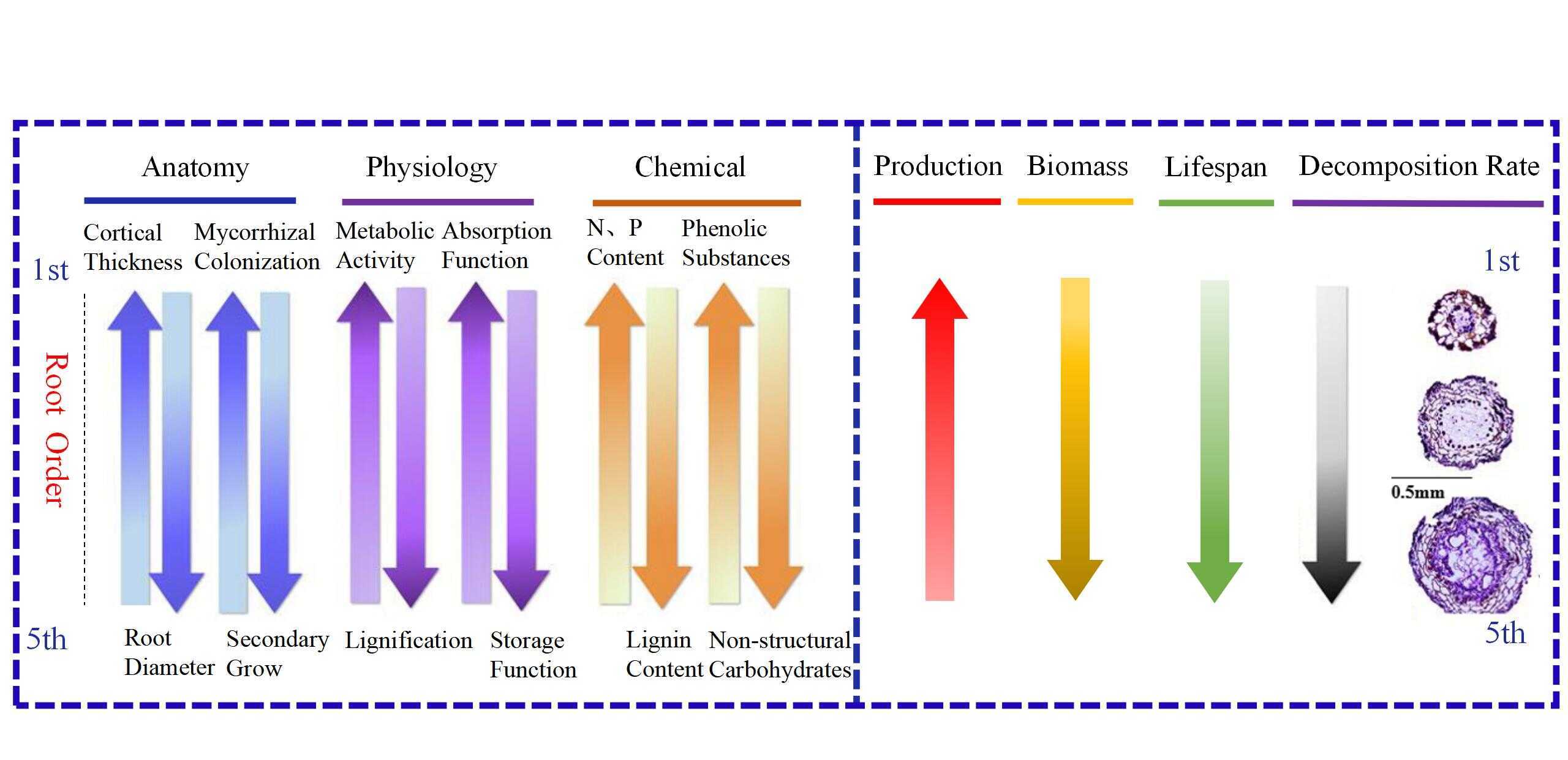 圖2 不同分支結(jié)構(gòu)(根序)細(xì)根的動(dòng)力學(xué)過程概念框架