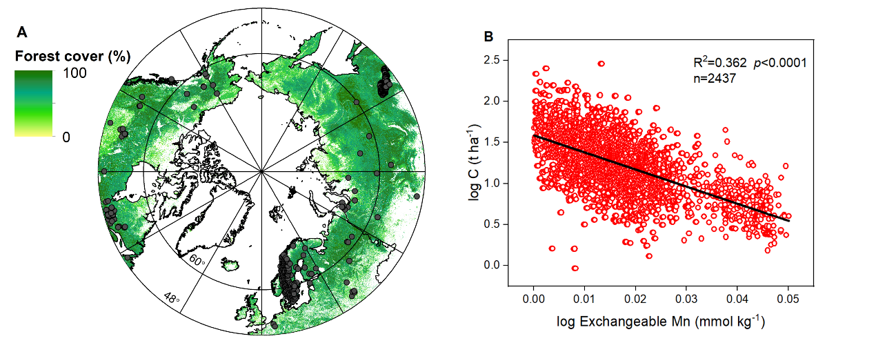 對我國大興安嶺落葉松人工林318個(gè)樣點(diǎn)腐殖層碳庫的調(diào)查研究,也表明腐殖質(zhì)層可交換態(tài)錳含量是調(diào)控碳庫的重要調(diào)控因子(r2=0.20)。同時(shí),結(jié)合瑞典國家森林土壤清查、瑞典國家森林清查數(shù)據(jù)以及數(shù)據(jù)整合分析的手段,建立了覆蓋全球北方森林范圍的2437個(gè)樣點(diǎn)的腐殖質(zhì)層碳儲(chǔ)量數(shù)據(jù),發(fā)現(xiàn)可交換態(tài)錳含量可以解釋北方森林腐殖層碳庫36%的變化(圖4)。研究結(jié)果與長期錳添加實(shí)驗(yàn)相互驗(yàn)證和補(bǔ)充。