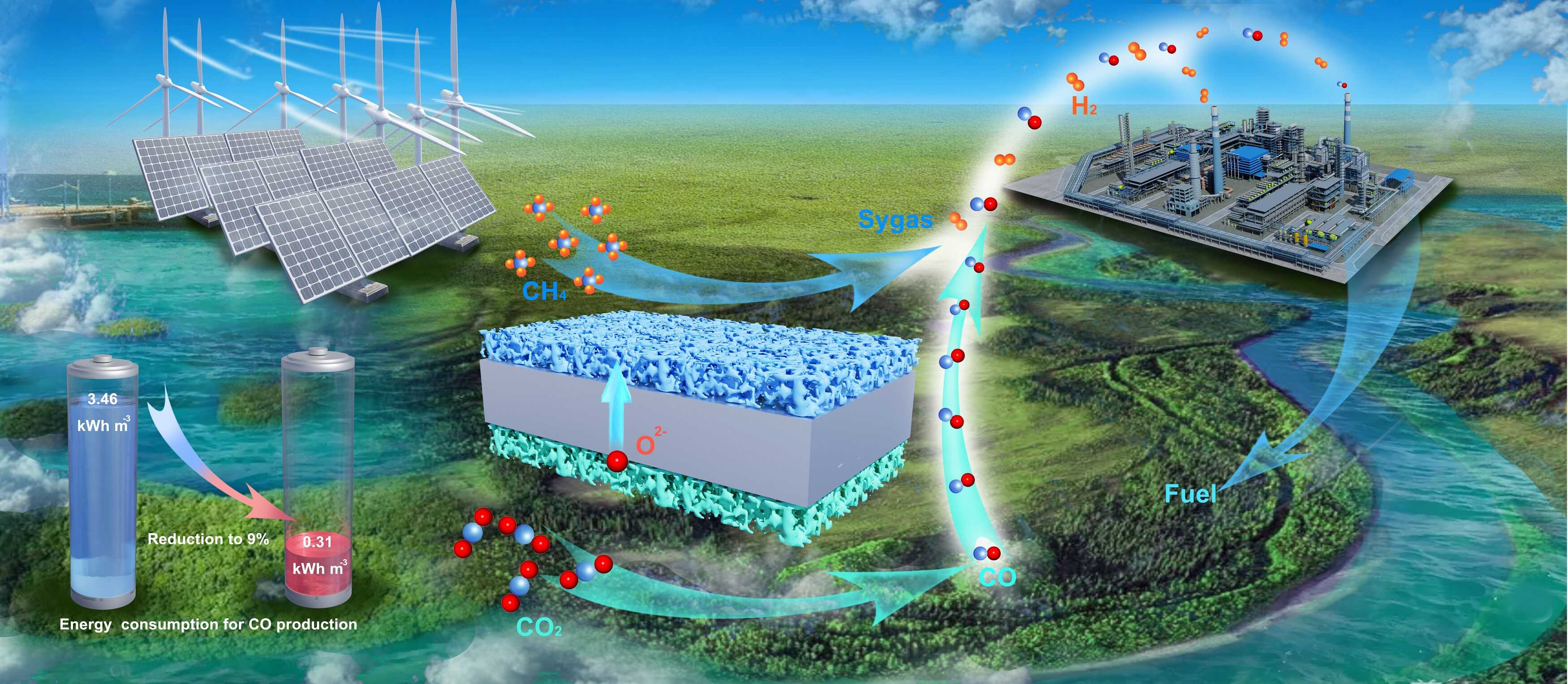 該團隊長期致力于基于固體氧化物電解池的高溫電催化研究,前期利用原位溶出和高溫分散法開發(fā)出了一系列高活性電化學(xué)表界面,用于高溫電極反應(yīng)。本工作中,團隊通過調(diào)控La0.6Sr0.4Ti0.3Fe0.7-xCoxO3- 陽極鈣鈦礦中B位Co\Fe比例,優(yōu)化B位過渡金屬溶出能,實現(xiàn)在La0.6Sr0.4Ti0.3Fe0.5Co0.2O3- (LSTFC2)鈣鈦礦表面原位溶出生成平均粒徑最小為7nm、顆粒密度最高為1087個 m-2的CoFe合金納米顆粒,為陽極CH4轉(zhuǎn)化提供了充足活性位點。研究還發(fā)現(xiàn),電驅(qū)動產(chǎn)生的溢流氧也可進一步促進甲烷吸附活化、抑制積碳形成,從而提升了陽極催化劑活性和穩(wěn)定性。800 C下,LSTFC2陽極CH4轉(zhuǎn)化率可達到86.9%,CO選擇性達到90.1%,連續(xù)穩(wěn)定運行1250 小時無顯著衰減。電化學(xué)性能測試表明,陽極引入甲烷半氧化重整反應(yīng)后,CO生產(chǎn)能耗從傳統(tǒng)SOEC的3.46 kWh/m3降低到0.31 kWh/m3。本工作為C1小分子升級轉(zhuǎn)化提供了新的研究思路。