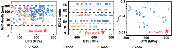 圖1. 高強(qiáng)高耐蝕7075鋁基復(fù)合材料優(yōu)異的耐晶間腐蝕、剝落腐蝕和應(yīng)力腐蝕性能
