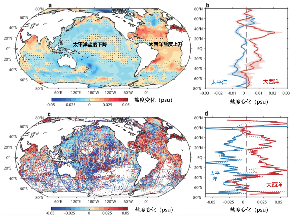該研究通過分析海洋0-2000米的觀測數(shù)據(jù),揭示了過去半個世紀(jì)中(1965年以來)大西洋-太平洋鹽度差(APSC)的顯著加強(qiáng)趨勢,即大西洋鹽度總體上升、太平洋鹽度普遍下降(圖1)。而且,這種趨勢還呈現(xiàn)出明顯的經(jīng)向結(jié)構(gòu),在南北半球的副熱帶均較為突出,其中北緯20-40度之間的APSC加強(qiáng)了5.9% 0.6%。APSC的加強(qiáng)具有廣泛的影響,特別是加劇了太平洋的海平面上升、海洋層化、次表層海水缺氧和酸化等趨勢。