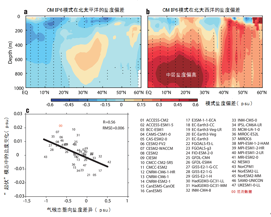 以往對鹽度變化的研究普遍強(qiáng)調(diào)表面淡水通量(即降水和蒸發(fā))的控制作用,并將海洋鹽度視為全球淡水循環(huán)變化的指示物。本研究通過熱力學(xué)模態(tài)分解(即分離“起伏”模態(tài)和“澀變”模態(tài))和LICOM3模式敏感性試驗(yàn),檢驗(yàn)了各種物理過程對鹽度長期變化的貢獻(xiàn)。結(jié)果顯示,除了降水和蒸發(fā)之外,風(fēng)場和海洋增暖也對大尺度鹽度變化趨勢具有重要作用。其中,風(fēng)場的長期變化導(dǎo)致風(fēng)生海洋環(huán)流變異,海洋表層變暖則導(dǎo)致水團(tuán)的形成源地向高緯度遷移,這些過程顯著改變了鹽分在海洋中的空間分布,即“鹽度再分配”作用,從而在APSC加強(qiáng)趨勢及其經(jīng)向結(jié)構(gòu)的形成中發(fā)揮了關(guān)鍵作用。上述過程在大西洋和太平洋均有發(fā)生,但由于兩大洋氣候態(tài)鹽度分布(如水平和垂向鹽度梯度)的差異,產(chǎn)生了截然不同的作用結(jié)果。當(dāng)前氣候模式(CMIP6)在鹽度變化的模擬中仍存在明顯偏差,普遍低估了大西洋鹽度的上升趨勢,這與模式對氣候態(tài)鹽度分布的模擬偏差有關(guān)(圖2)。大多數(shù)CMIP6模式模擬的大西洋表層鹽度偏低,中層鹽度偏高,因此嚴(yán)重低估了垂向鹽度梯度。這使得模式中海洋動力過程的鹽度再分配作用偏弱,因此低估了大西洋鹽度的升高趨勢。