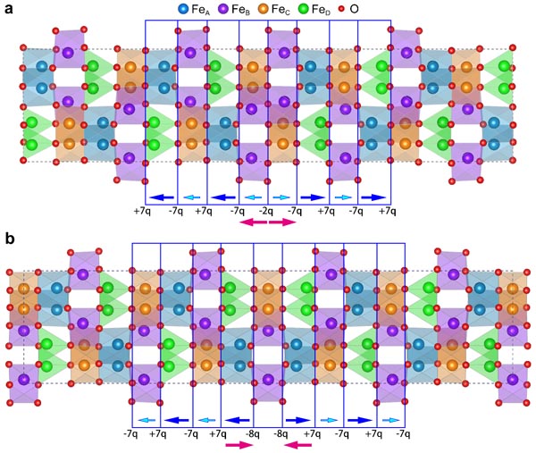 為了探索疇壁處的新穎界面現(xiàn)象與物性,中國(guó)科學(xué)院金屬研究所沈陽(yáng)材料科學(xué)國(guó)家研究中心材料結(jié)構(gòu)與缺陷研究部的相關(guān)團(tuán)隊(duì),圍繞磁電多鐵材料中鐵電疇壁處的鐵電極化行為和磁性耦合機(jī)制開(kāi)展了系統(tǒng)性的研究工作,發(fā)現(xiàn) -Fe2O3中疇壁處的鐵電極化行為受束縛電荷密度的調(diào)控。研究表明, -Fe2O3薄膜中存在兩種類型的180 尾對(duì)尾鐵電疇壁。透射電鏡原子結(jié)構(gòu)表征的結(jié)果表明,在I型疇壁處出現(xiàn)了罕見(jiàn)的鐵電極化顯著增強(qiáng)(約43%)現(xiàn)象(如圖2所示),而在II型疇壁處的鐵電極化強(qiáng)度減弱至接近于零(如圖3所示)。第一性原理計(jì)算表明,I型疇壁處束縛電荷密度低,從而導(dǎo)致其鐵電極化增強(qiáng);II型疇壁處的束縛電荷密度高,從而導(dǎo)致其鐵電極化減弱(如圖4所示)。I型和II型鐵電疇壁處的磁性耦合方式分別為反鐵磁性耦合和鐵磁性耦合(如圖5所示),它們對(duì) -Fe2O3的磁學(xué)性能具有重要影響。該研究表明磁電多鐵材料中疇壁處的鐵電極化可表現(xiàn)出顯著增強(qiáng)的現(xiàn)象,鐵電疇壁在其磁學(xué)性能方面也發(fā)揮著重要作用,這不僅深化了人們對(duì)磁電多鐵材料中豐富物理現(xiàn)象與行為的認(rèn)識(shí),還為提升其性能及推進(jìn)其實(shí)際應(yīng)用提供了新思路。