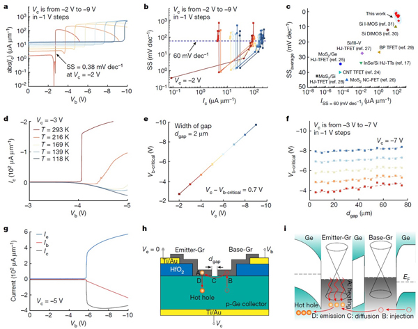 a. 轉(zhuǎn)移特性曲線;b. 亞閾值擺幅與電流關(guān)系圖;c. 亞閾值擺幅性能對(duì)比圖;d. 轉(zhuǎn)移特性中電流的溫度依賴性;e. 臨界基極偏壓與集電極偏壓關(guān)系圖;f. 臨界基極偏壓與縫隙寬度關(guān)系圖;g. 發(fā)射極電流與基極偏壓關(guān)系圖;h. 載流子在晶體管中的流向圖;i.器件能帶圖。