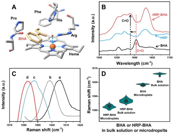 該研究通過辣根過氧化物酶的分子抑制劑-苯并羥肟酸,探測了本體溶液和微滴(氣溶膠)界面處辣根過氧化物酶的內(nèi)部電場,發(fā)現(xiàn)了微滴(氣溶膠)可以增強酶催化反應的反應路徑選擇性和底物選擇性。進一步,該研究通過密度泛函理論和分子動力學模擬,證實了微滴(氣溶膠)界面的超強電場是增強辣根過氧化物酶內(nèi)部電場并影響催化活性和催化選擇性的關(guān)鍵機制。該研究明確了微滴(氣溶膠)增強酶活性的機制,并探討了微滴反應器在高靈敏生物分析和高效生物合成的應用。