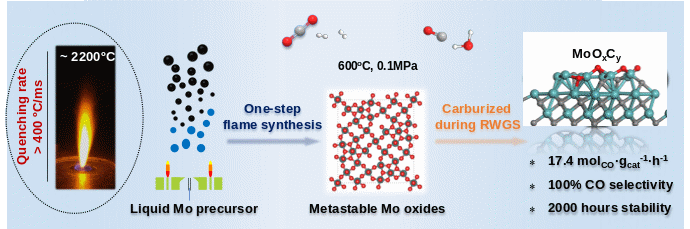 近日,中國科學院大連化學物理研碳資源小分子與氫能利用研究組研究員孫劍和副研究員俞佳楓團隊在碳化鉬催化CO2轉化利用方面取得新進展,利用火焰噴射裂解法(FSP)一步合成了亞穩(wěn)態(tài)不飽和氧化鉬催化劑。該亞穩(wěn)態(tài)結構的氧化鉬無需碳化處理,可直接應用于逆水汽變換(RWGS)反應中,在反應氣氛下迅速發(fā)生原位碳化,生成碳氧化鉬活性相,在高空速的苛刻條件下仍展現(xiàn)出優(yōu)異的催化活性和穩(wěn)定性。該方法省去了繁瑣的碳化制備過程,解決了傳統(tǒng)的碳化鉬催化劑在反應中易被氧化失活的問題。