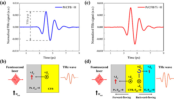 圖1. (a)和(b)Pt/CoFeB結(jié)構(gòu)中太赫茲輻射信號圖和原理示意圖,(c)和(d)Pt/CoFeB/Ti結(jié)構(gòu)中太赫茲輻射信號和原理示意圖。