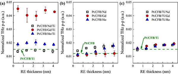 中國科學(xué)院金屬研究所沈陽材料科學(xué)國家研究中心功能材料與器件研究部基于過去多年在自旋電子學(xué)研究領(lǐng)域的工作積累,通過和中山大學(xué)物理學(xué)院合作,在多層膜異質(zhì)結(jié)構(gòu)中引入稀土(RE)金屬插層,發(fā)現(xiàn)了和稀土種類密切相關(guān)的自旋-軌道流轉(zhuǎn)化機(jī)制。結(jié)果發(fā)現(xiàn),在Pt/CoFeB(/Ti)異質(zhì)結(jié)中,太赫茲的產(chǎn)生主要依靠逆自旋霍爾效應(yīng)和逆軌道霍爾效應(yīng)實(shí)現(xiàn)自旋-電荷、自旋-軌道-電荷流的轉(zhuǎn)化,從而對外輻射太赫茲脈沖。將稀土金屬Nd、Gd和Ho插入到CoFeB和Ti層中間后,稀土的自旋軌道耦合顯著地影響了CoFeB-Ti一側(cè)的自旋-軌道流轉(zhuǎn)化過程。具體如下:輕稀土Nd(4f電子殼層少于半滿)將負(fù)極化的自旋流(-JS)轉(zhuǎn)化為負(fù)極化的軌道流(-JL),隨后在Ti層中轉(zhuǎn)化為負(fù)極化的電荷流(-JC),最終導(dǎo)致含稀土Nd插層樣品的太赫茲峰對峰強(qiáng)度(THz p-p)弱于對照樣品Pt/CFB/Ti的強(qiáng)度值。反之,重稀土Gd和Ho(4f電子殼層半滿及多于半滿)將負(fù)極化的自旋流(-JS)轉(zhuǎn)化為正極化的軌道流(+JL),隨后在Ti層中轉(zhuǎn)化為正極化的電荷流(+JC),從而在含重稀土插層的樣品中觀察到了增強(qiáng)的太赫茲峰對峰強(qiáng)度。另一方面,對照樣品(Pt/CoFeB/RE和Pt/CoFeB/Ti/RE)的太赫茲測量結(jié)果可以排除稀土金屬自身的自旋-電荷流轉(zhuǎn)化的影響??焖俑道锶~變換結(jié)果進(jìn)一步證明,稀土金屬Gd有助于提高太赫茲輻射的整體頻譜范圍和強(qiáng)度。