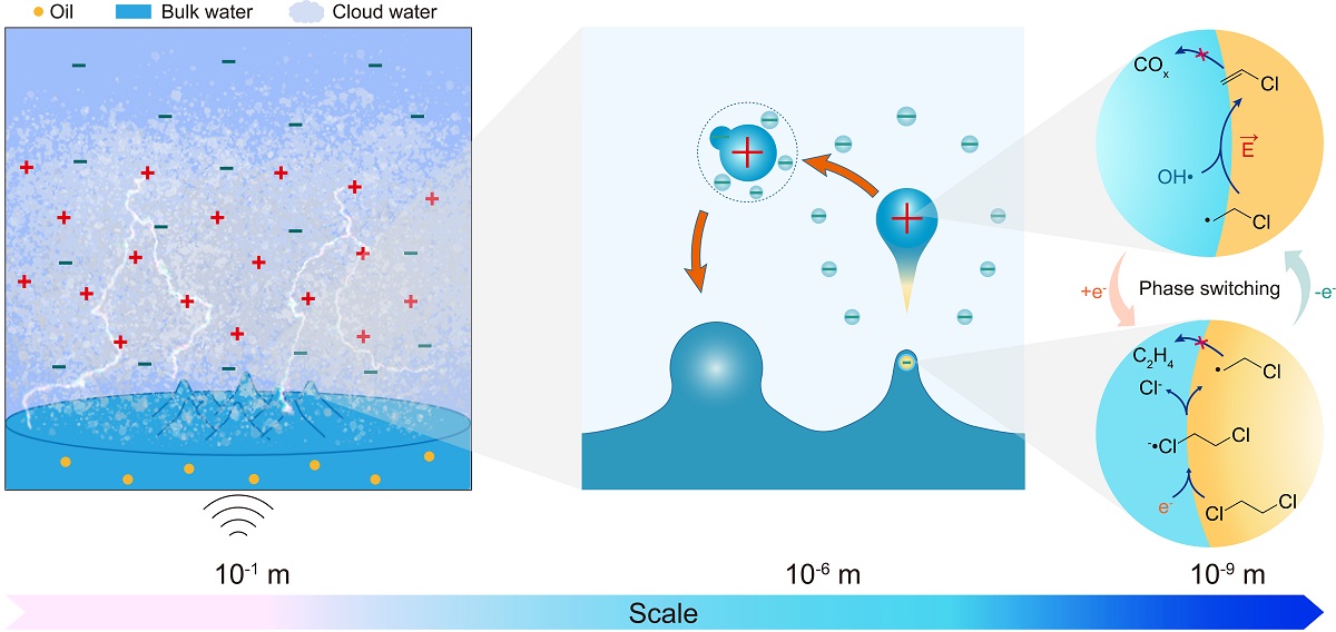 基于前期對帶電微液滴氧化還原反應(yīng)的研究,本工作中,團隊在封閉環(huán)境中通過超聲驅(qū)動水在微液滴、水汽,以及體相之間快速轉(zhuǎn)變,制備出具有交流電壓的人造云,并以此實現(xiàn)了二氯乙烷的電化學(xué)選擇性脫氯反應(yīng)。研究人員通過云水中的電壓和電流測量證實,尺寸較大的微液滴帶正電,水汽中尺寸較小的亞微米液滴帶負(fù)電,并且兩種液滴具有不同的擴散行為和空間分布。研究發(fā)現(xiàn),通過封閉環(huán)境限制亞微米液滴的擴散空間,可以增強液滴之間的起電和放電作用。電子順磁共振譜(EPR)表征進一步確認(rèn)了電子轉(zhuǎn)移參與了液滴的起電和放電過程,導(dǎo)致體相表面富集氫自由基,而微液滴富集羥基自由基。進一步,團隊通過EPR、液相色譜-高分辨率質(zhì)譜、氣相色譜等表征方法證明,水中的二氯乙烷首先在體相表面附近發(fā)生還原脫氯,生成氯乙基自由基中間體,隨后,該中間體隨著霧化過程進入微液滴,并在其中加速氧化脫氫,生成氯乙烯。由于水在微液滴、水汽以及體相之間快速轉(zhuǎn)變,避免了反應(yīng)物和中間體的擴散限制,可顯著提高超聲霧化作用下氯乙烯的生成速率和選擇性,相比超聲空化作用,超聲霧化作用的速率提升兩個數(shù)量級,氯乙烯在C2氣體產(chǎn)物中的選擇性最高可達(dá)80%左右。利用上述工作提出的借助微液滴體系,可有望實現(xiàn)對有機氯廢水的升級利用。
