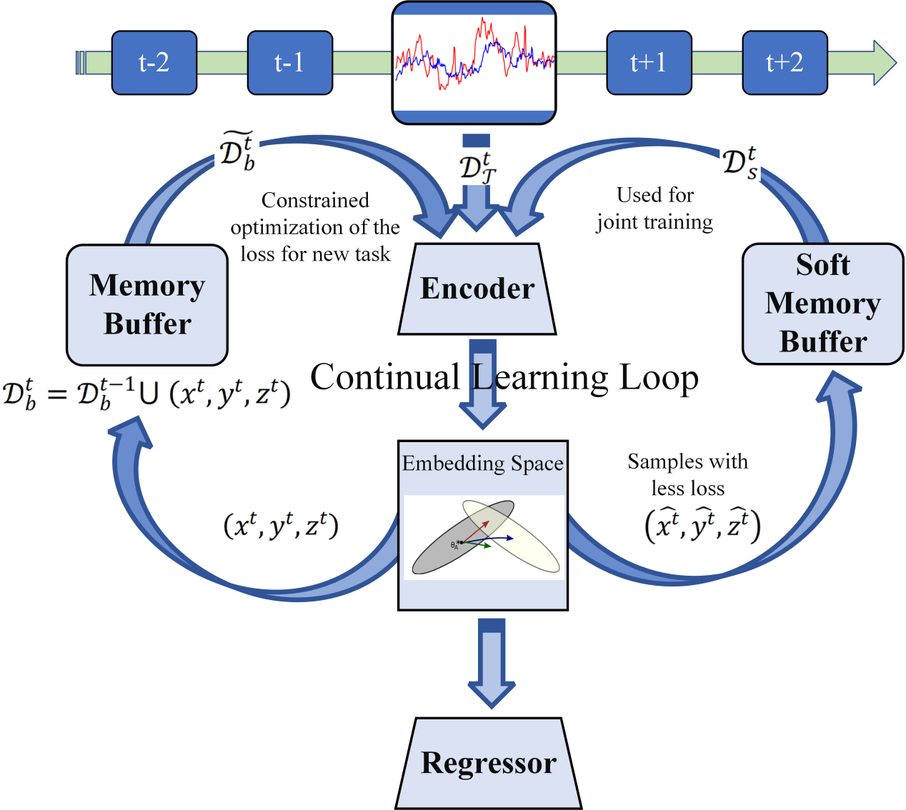 該研究從網(wǎng)絡訓練和網(wǎng)絡結構兩個方面改進了持續(xù)學習方法。團隊通過基于提示的網(wǎng)絡參數(shù)學習保留了先前任務的“暗知識”,有效緩解災難性遺忘,同時,引入軟記憶緩沖區(qū)使模型能夠更好地學習當前任務,從而在穩(wěn)定性與可塑性之間實現(xiàn)平衡。此外,團隊在網(wǎng)絡結構層面提出了一種時間敏感的激活函數(shù)TimeRelu,使網(wǎng)絡激活閾值隨時間變化,從而提高了模型的泛化能力。該方法在開源的太陽能發(fā)電數(shù)據(jù)集和實際的磨礦分級過程數(shù)據(jù)集上驗證了其有效性。