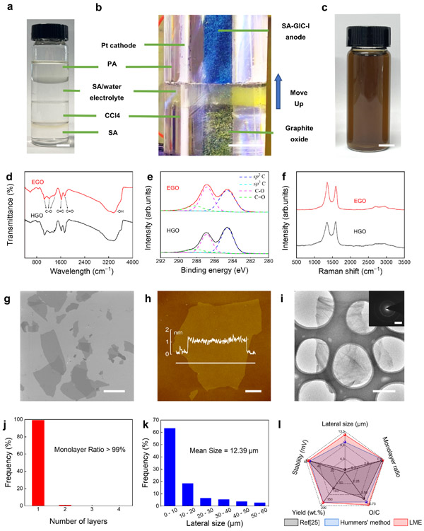 該工作不僅為電化學(xué)制備GO提供了新的認(rèn)識(shí),而且提供了一種低成本、高產(chǎn)率、可持續(xù)制備均一單層GO的方法,為GO的工業(yè)化生產(chǎn)和應(yīng)用奠定了基礎(chǔ)。1月16日,該研究成果以“Control of water for high-yield and low-cost sustainable electrochemical synthesis of uniform monolayer graphene oxide”為題在《Nature Communications》上在線發(fā)表。