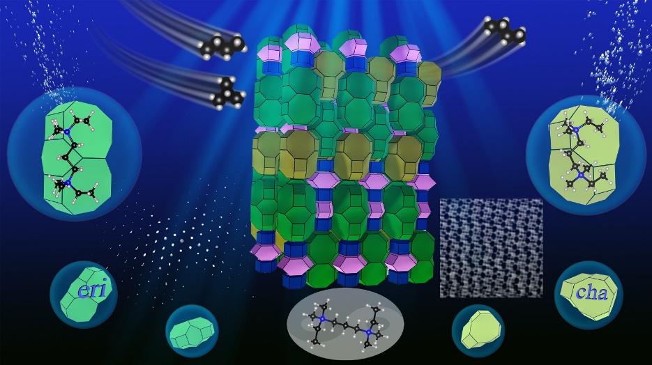 本工作中,科研人員選用雙頭季銨鹽作為OSDA,通過對其碳鏈長度和端基尺寸進行精細調控,合成了一種全新納米級小孔磷鋁分子篩,并將其命名為“DNL-17”。團隊進一步利用三維電子衍射技術直接確定了DNL-17的復雜晶體結構。研究發(fā)現,DNL-17屬于ABC-6家族,具有小孔8×8×8元環(huán)三維貫穿孔道,其骨架結構中包含四種不同類型的分子篩籠(d6r、can、eri和cha),并且沿c軸方向形成了多達24層的復雜堆垛序列(AABAACAABBCBBABBCCACCBCC)。結合理論計算和固體核磁碳譜表征結果,科研人員揭示了DNL-17合成過程中,OSDA采用不同構象來穩(wěn)定不同分子篩籠。這一發(fā)現證實了OSDA可以通過不同構象構建全新磷鋁分子篩結構,為新型分子篩的設計合成提供了新思路。此外,研究還發(fā)現DNL-17在正丁烷和異丁烷分離過程中表現出了良好的選擇吸附性能。