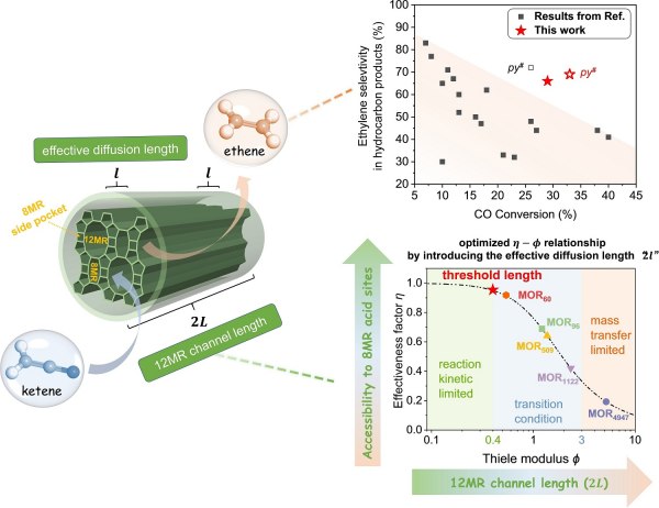 絲光沸石(MOR)分子篩具有獨(dú)特孔結(jié)構(gòu),其中8元環(huán)內(nèi)的酸性位為合成氣轉(zhuǎn)化的活性位點(diǎn),12元環(huán)孔道為分子的傳輸通道。該研究以MOR分子篩作為模型催化劑,分析了不同12元環(huán)孔道長度的MOR在合成氣轉(zhuǎn)化中的傳質(zhì)效應(yīng),建立了活性位的可及性與催化性能的定量關(guān)系。研究通過分析有效擴(kuò)散長度、Thiele模數(shù)與反應(yīng)速率有效因子之間的關(guān)系,確定了在合成氣轉(zhuǎn)化反應(yīng)中12MR孔道長度為60nm,接近消除擴(kuò)散限制的關(guān)鍵閾值?;诖?,研究優(yōu)化了ZnAlOx-MOR雙功能催化劑,實(shí)現(xiàn)了一氧化碳轉(zhuǎn)化率33%、乙烯選擇性69%的優(yōu)異性能。