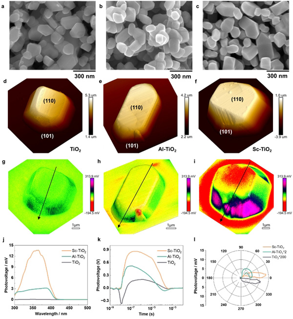 針對(duì)該難題,中國(guó)科學(xué)院金屬研究所沈陽材料科學(xué)國(guó)家研究中心劉崗團(tuán)隊(duì)提出了基于低價(jià)金屬摻雜協(xié)同調(diào)控體相缺陷和暴露特定晶面實(shí)現(xiàn)光生電荷高效利用的研究策略。具體地,選取與Ti元素在元素周期表上相鄰的Sc為摻雜元素。在材料的體相,一方面Sc3?離子的半徑與Ti3?離子接近,因此Sc部分取代Ti原子后并不會(huì)帶來晶格畸變等缺陷;另一方面Sc的穩(wěn)定價(jià)態(tài)為+3價(jià),與缺陷態(tài)的Ti3?價(jià)態(tài)相同,因此基于電荷平衡和Sc與氧空位的相互作用,就實(shí)現(xiàn)了對(duì)Ti3?的有效消除(圖1)。TiO?的表面與體相不同,Ti和O元素都是以不飽和配位的狀態(tài)存在,不飽和配位數(shù)是與所暴露的晶面直接相關(guān)的,表面Ti元素的配位數(shù)越低,表面能越高,越不穩(wěn)定,在制備過程中越不容易得到。而在Sc摻雜的TiO?中,Sc與氧空位總是共存的特性使得Sc周圍本身所需要的氧原子就相對(duì)較少。因此表面Ti原子被Sc替代后,將極大降低高能晶面的表面能,這樣就可以制備得到{101}晶面暴露的金紅石TiO??;诖?,研究團(tuán)隊(duì)就制備得到了{(lán)101}與{110}晶面同時(shí)存在的二氧化鈦。打破了材料表面的對(duì)稱性,并且在兩個(gè)晶面間存在約1kV/cm的電場(chǎng),該電場(chǎng)的強(qiáng)度與p-n結(jié)型太陽能電池的體相電場(chǎng)基本相當(dāng)(圖2)。