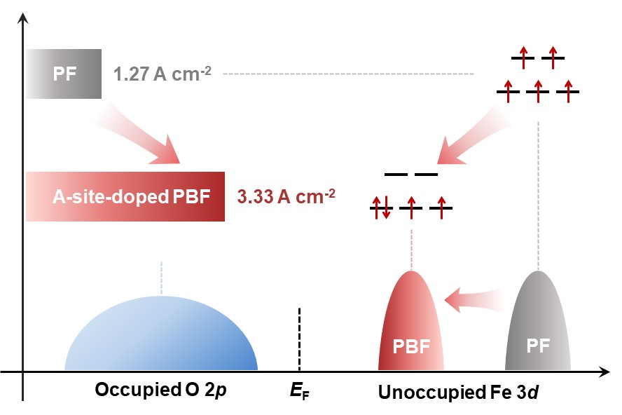 在本工作中,研究團(tuán)隊(duì)構(gòu)建了一系列堿土金屬摻雜的Pr?.?Ae?.?FeO??δ材料(Ae = Ca,Sr,Ba,分別記為PCF、PSF和PBF)。電化學(xué)測(cè)試結(jié)果表明,隨著堿土金屬離子半徑的增大,材料的高溫OER性能逐步提升。研究團(tuán)隊(duì)利用電導(dǎo)弛豫、1?O同位素交換、準(zhǔn)原位TOF-SIMS、原位XPS等多種物理化學(xué)表征手段,并結(jié)合理論計(jì)算發(fā)現(xiàn),摻雜較大半徑的堿土金屬可增強(qiáng)Fe 3d–O 2p軌道雜化、降低電荷轉(zhuǎn)移能,從而促進(jìn)氧物種遷移與表面溢流過(guò)程,加速陽(yáng)極反應(yīng)動(dòng)力學(xué),提升高溫OER性能。進(jìn)一步的磁學(xué)測(cè)試(穆斯堡爾譜與磁化率-溫度曲線)揭示了電子自旋態(tài)的關(guān)鍵作用:隨著鋇(Ba)元素的引入,PrFeO??δ中的鐵離子部分由高自旋三價(jià)鐵(t2g3eg2)轉(zhuǎn)變?yōu)榈妥孕膬r(jià)鐵(t2g4eg0),導(dǎo)致eg電子數(shù)減少,從而有效促進(jìn)了高溫OER過(guò)程。