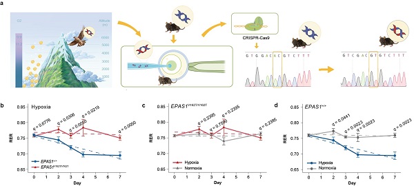 研究運(yùn)用基因編輯技術(shù)首次建立了EPAS1隼型小鼠模型,在模擬慢性低氧環(huán)境下,利用呼吸交換率(RER)來探究隼型小鼠在低氧條件下的糖、脂代謝偏向性。低氧處理后,隼型小鼠的RER值在0.75附近隨機(jī)波動,而野生型小鼠的RER值顯著降低(脂代謝偏向),說明隼型小鼠在低氧下具有維持糖脂代謝平衡的能力。肝臟轉(zhuǎn)錄組、代謝組分析印證了隼型小鼠肝具有更好的糖脂代謝調(diào)節(jié)能力。功能驗(yàn)證實(shí)驗(yàn)發(fā)現(xiàn)突變型EPAS1蛋白活性降低,鈍化了隼型小鼠的低氧反應(yīng)。此外,研究還分析了行為調(diào)節(jié)在隼型小鼠糖脂代謝穩(wěn)態(tài)維持中的重要作用。從進(jìn)化角度看,隼型小鼠維持糖脂代謝穩(wěn)態(tài)在機(jī)體應(yīng)對低氧脅迫時(shí)具有重要意義:體重在低氧下可較快恢復(fù),減少體內(nèi)氧化應(yīng)激反應(yīng),并提高急性低氧下小鼠的存活率。