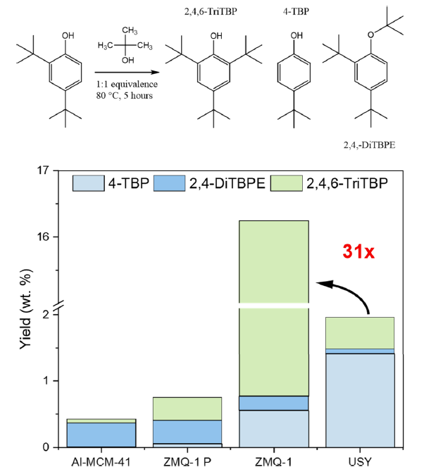 催化性能測(cè)試以大體積的2,4-二叔丁基苯酚與叔丁醇的烷基化反應(yīng)為模型,結(jié)果顯示,無(wú)磷ZMQ-1對(duì)目標(biāo)產(chǎn)物2,4,6-三叔丁基苯酚的收率達(dá)到15.5%,比工業(yè)常用的多級(jí)孔USY沸石(0.5%)提高了31倍,也遠(yuǎn)超無(wú)定形孔壁的Al-MCM-41。這一優(yōu)異性能歸因于ZMQ-1規(guī)整的10/12元環(huán)窗口級(jí)晶體介孔結(jié)構(gòu),其能夠穩(wěn)定大體積過(guò)渡態(tài)是無(wú)定形材料無(wú)法實(shí)現(xiàn)的。該研究不僅為ZMQ-1的催化應(yīng)用奠定了堅(jiān)實(shí)基礎(chǔ),也為其它基于磷模板劑合成的超大孔沸石的結(jié)構(gòu)優(yōu)化和性能調(diào)控提供了系統(tǒng)性的研究范本。隨著精細(xì)化工和生物質(zhì)轉(zhuǎn)化等領(lǐng)域?qū)Υ蠓肿哟呋枨蟮牟粩嘣鲩L(zhǎng),ZMQ-1這類兼具沸石酸性和介孔可及性的新材料有望發(fā)揮越來(lái)越重要的作用。