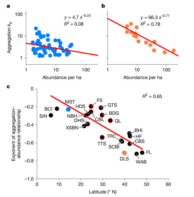 圖1.不同緯度梯度下森林樹種聚集度和多度關(guān)系(a 熱帶森林,b 溫帶森林,?c 緯度格局)