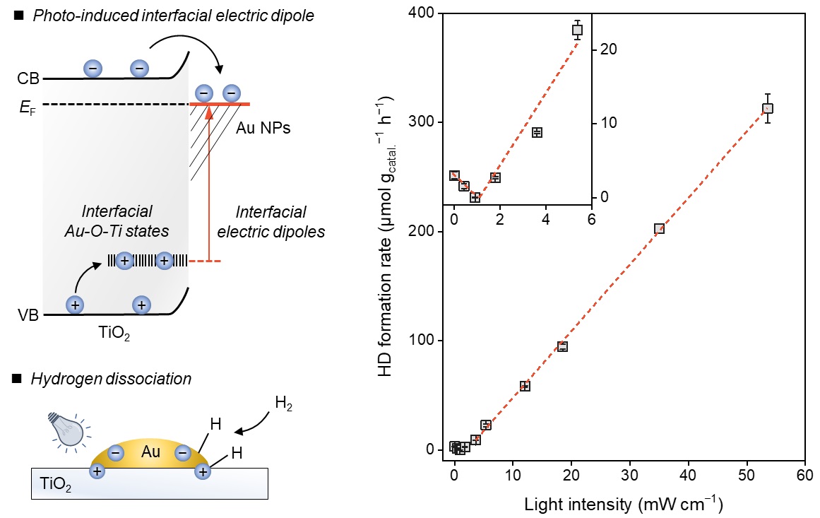 科研人員以金/二氧化鈦(Au/TiO2)為模型催化劑,利用紫外光激發(fā)TiO2,研究結果認為:光激發(fā)產(chǎn)生的電子可遷移到Au納米顆粒上而被束縛;同時,由于Au納米顆粒和TiO2的界面存在Au-O-Ti組成的缺陷態(tài),光生空穴會在界面處被捕獲。研究發(fā)現(xiàn),由于空穴和電子分別在界面Au-O-Ti和Au納米顆粒上,從而形成了空間鄰近的束縛態(tài)電子-空穴對。Au/TiO2在常溫條件下同時存在氫氣異裂的熱催化機制,與Au/TiO2上光催化氫氣異裂的機制疊加,使科研人員觀察到該反應活性隨著光強增強先降低后呈線性增加的現(xiàn)象。