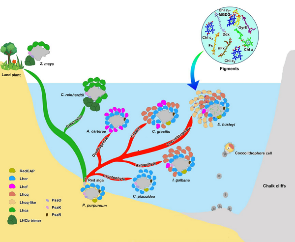 光系統(tǒng)I-捕光天線復(fù)合體在光合作用中負(fù)責(zé)將光能轉(zhuǎn)化為化學(xué)能。由于光合生物對不同光環(huán)境的適應(yīng)性,該復(fù)合體在結(jié)構(gòu)和大小上呈現(xiàn)顯著差異。特別是從海岸帶向“陸”和“洋”兩個方向的環(huán)境適應(yīng)過程中,光系統(tǒng)I-捕光天線復(fù)合體更是經(jīng)歷了深刻的演化。顆石藻起源于古海岸帶,于中生代征服遠(yuǎn)洋并達(dá)到繁盛,對當(dāng)今全球的氣候和生態(tài)意義重大。其中,赫胥黎艾氏藻(Emiliania huxleyi)是顆石藻類群中最著名的模式生物,是海岸帶生物學(xué)中的重要研究對象。因此,赫胥黎艾氏藻光系統(tǒng)I-捕光天線復(fù)合體光能利用分子機制的研究對于海岸帶生物適應(yīng)性進(jìn)化的研究意義非常重大。