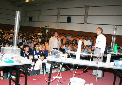 5月21、22日上午,桑鳳亭院士和沙國(guó)河院士分別做了題為《氧碘化學(xué)激光及其應(yīng)用》和《奇妙的科學(xué)實(shí)驗(yàn)——現(xiàn)場(chǎng)演示》的精彩的科普?qǐng)?bào)告,報(bào)告深受歡迎,現(xiàn)場(chǎng)爆滿,很多聽(tīng)眾慕名而來(lái)。應(yīng)廣大聽(tīng)眾的要求,兩位院士的報(bào)告都由原定的一場(chǎng)臨時(shí)增加為兩場(chǎng),聽(tīng)眾人數(shù)共計(jì)800余名。參加報(bào)告的學(xué)生們?cè)谟H自上臺(tái)參與實(shí)驗(yàn)操作的過(guò)程中,體會(huì)到科學(xué)實(shí)驗(yàn)的樂(lè)趣,紛紛表示參與科普?qǐng)?bào)告收獲不小。質(zhì)量處處長(zhǎng)肖馳、圖書(shū)檔案信息中心主任盧振舉分別應(yīng)邀主持了報(bào)告會(huì)。