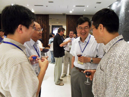 金屬所所長(zhǎng)盧柯院士出席會(huì)議歡迎酒會(huì),向與會(huì)代表表示熱烈歡迎。圖為盧柯與麻省理工學(xué)院Sidney Yip教授、斯坦福大學(xué)蔡巍教授和俄亥俄州立大學(xué)王云志教授親切交談。