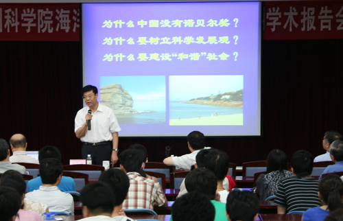 李乃勝副廳長以“為什么中國沒有諾貝爾獎?為什么要樹立科學發(fā)展觀?為什么要建設“和諧”社會?”三個為什么開篇,回顧了世界主要經(jīng)濟、科技中心的發(fā)展歷史,結(jié)合我國科學事業(yè)的發(fā)展進程、重要科技成果,從社會、人文環(huán)境,經(jīng)濟、政治等方面深刻闡述了科學技術(shù)在當今世界發(fā)展中不可代替的重要作用。同時,李乃勝副廳長祝賀海洋研究所即將迎來60周年華誕,祝愿海洋研究所為我國海洋科學事業(yè)做出更大貢獻。