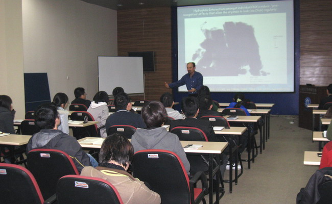 11月5日,Dimitris .S. Argyropoulos教授做了題為 “Opportunities for the Forest Biorefinery with Dissolved Wood”和“The use of cellulose nanocrystal as scaffolds for nanodevices : supromolecular chemistry using nature’s most ambundant template”的學(xué)術(shù)報(bào)告,系統(tǒng)、詳細(xì)介紹了基于離子液體生物煉制平臺(tái)的基本科學(xué)問題,及在生物質(zhì)能源,生物基材料上的應(yīng)用,同時(shí)與大家就如何利用天然纖維素材料制備纖維素納米晶材料,纖維素納米晶材料的功能化改性及潛在的應(yīng)用進(jìn)行了探討。
