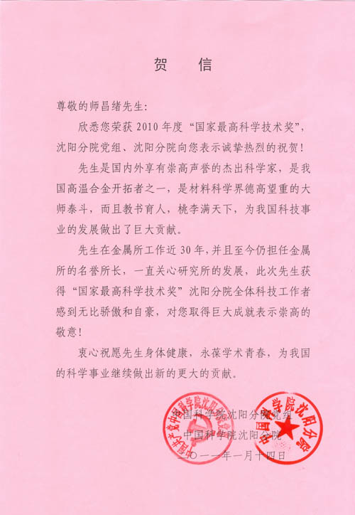 2011年1月14日,沈陽分院向中國科學(xué)院金屬研究所名譽(yù)所長師昌緒院士發(fā)去賀信,祝賀他榮獲2010年度國家最高科學(xué)技術(shù)獎。