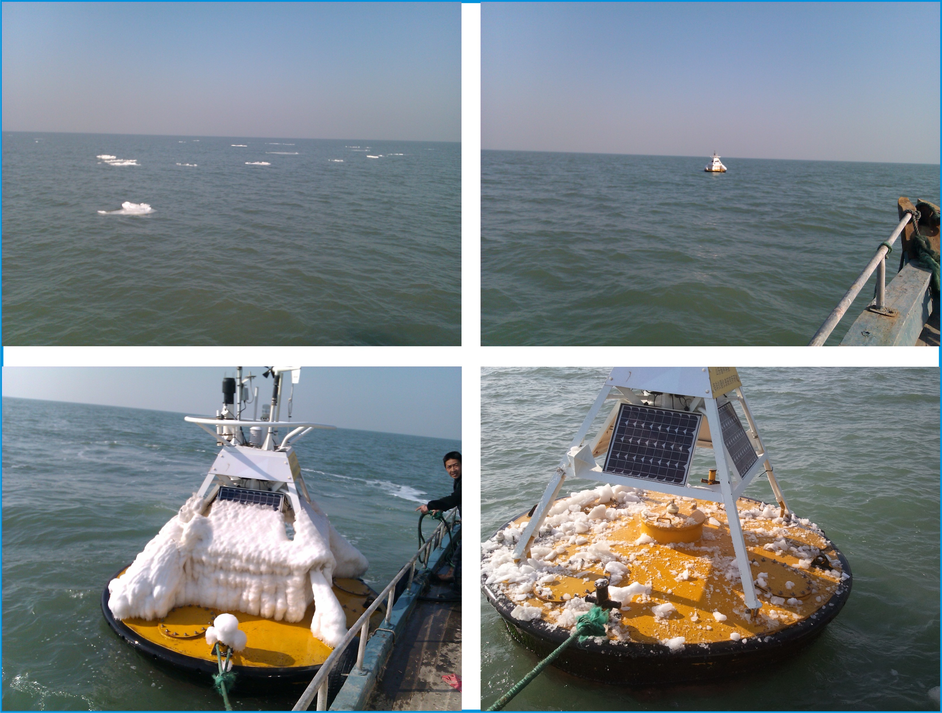 由于入冬以來(lái),山東半島尤其是威海、榮成一帶多雪、天氣極為寒冷,致使榮成楮島近岸結(jié)了厚厚的冰,在距離海岸10公里的觀測(cè)浮標(biāo)系統(tǒng)布放海域都可看到浮冰。由于寒冷、多雪,使得觀測(cè)浮標(biāo)體和太陽(yáng)能板上結(jié)滿了厚厚的冰層,觀測(cè)浮標(biāo)系統(tǒng)水上部分幾乎被厚厚的冰層覆蓋,嚴(yán)重影響了觀測(cè)浮標(biāo)系統(tǒng)的正常運(yùn)行。1月31日,項(xiàng)目組曾派人專程出海到現(xiàn)場(chǎng)進(jìn)行觀測(cè)浮標(biāo)體和太陽(yáng)能板除冰,但很快觀測(cè)浮標(biāo)體表面和太陽(yáng)能板上又結(jié)滿了厚厚的冰,降低了太陽(yáng)能板向系統(tǒng)蓄電池組的充電效能,導(dǎo)致觀測(cè)浮標(biāo)系統(tǒng)因供電不足而停止運(yùn)行。