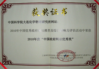 會上表彰了獲得2010年度各種榮譽獎項的單位,中科院大連化學(xué)物理研究所網(wǎng)站獲得了2010年度“中國政府網(wǎng)站優(yōu)秀獎”。