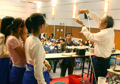 啟動大會后,沙國河院士在禮堂做了題為《奇妙的科學實驗——現(xiàn)場演示》的精彩的科普報告,報告深受歡迎,現(xiàn)場爆滿,很多聽眾慕名而來。兩場報告聽眾人數(shù)達400余名。參加報告會的中小學生們還親自上臺參與實驗操作,來揭秘神奇的化學現(xiàn)象。在實驗過程中,同學們充分體會到了科學實驗的樂趣。