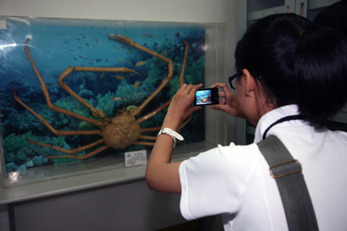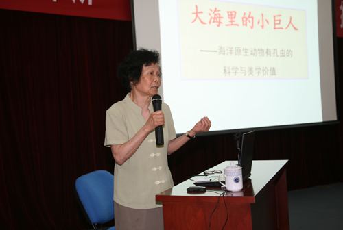 鄭守儀院士為小記者們作了題為“大海中的小巨人——有孔蟲(chóng)”科普?qǐng)?bào)告,并現(xiàn)場(chǎng)展示了有孔蟲(chóng)模型,指導(dǎo)小記者們利用顯微鏡觀察有孔蟲(chóng)標(biāo)本。小記者們還參觀了中科院海洋生物標(biāo)本館。