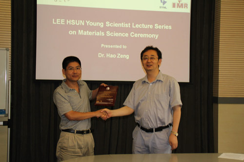 應金屬所邀請,2011年度“李薰青年學者講座獎”(Lee Hsun Young Scientist Lecture Series on Materials Science)獲得者、美國紐約州立大學布法羅分校曾浩博士于7月6日至7月15日到金屬所開展合作研究和學術交流。7月14日,曾浩博士進行了題為“磁性納米結構”的專題報告,報告會上,張志東研究員為曾浩博士頒發(fā)“李薰青年學者講座獎”獎牌。