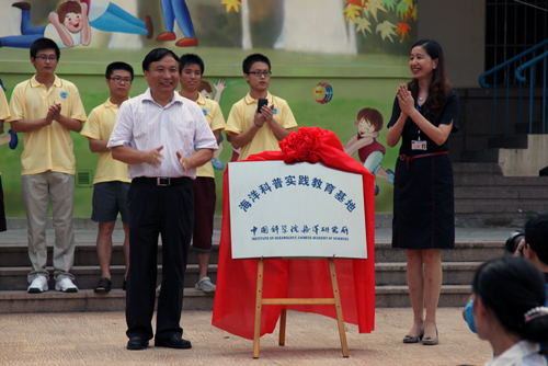 海洋研究所黨委書記王啟堯和青島嘉峪關(guān)小學(xué)校長徐學(xué)紅共同為“海洋科普實(shí)踐教育基地”揭牌,海洋所研究生黨總支書記屠國華、中科院海洋生物標(biāo)本館副館長王少青,以及19名博士實(shí)踐團(tuán)的成員作為海洋科普志愿者參加了揭牌儀式。