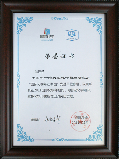 日前,中國(guó)化學(xué)會(huì)2011年工作會(huì)議在廣東惠州大亞灣舉行。會(huì)上,頒發(fā)了“國(guó)際化學(xué)年在中國(guó)”先進(jìn)單位獎(jiǎng)項(xiàng),中科院大連化學(xué)物理研究所因在2011國(guó)際化學(xué)年期間普及化學(xué)知識(shí)、宣傳化學(xué)形象做出的突出貢獻(xiàn)而獲此殊榮。