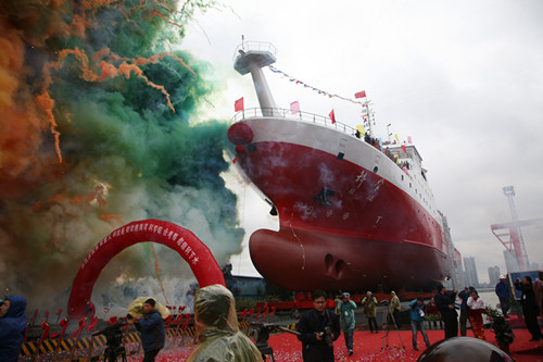 丁仲禮、孫偉、田承忠、李國安、劉艷榮、王延覺、孫群、張惠、孫松、黃瞿記等領導為海洋科學綜合考察船下水剪彩。丁仲禮、孫偉、田承忠、李國安、劉艷榮、王延覺、張惠觸摸“水晶球”啟動下水指令,中國科學院副院長丁仲禮為海洋科學綜合考察船下水行“擲瓶禮”,并宣布“國家重大科技基礎設施—海洋科學綜合考察船下水開始”,儀式現(xiàn)場禮炮齊鳴,威武的“科學”號在眾人矚目下緩緩從船臺滑下駛入長江。