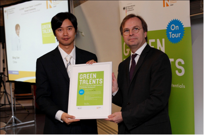 德國聯(lián)邦教研部自2009 年開始舉辦名為“綠色精英——國際可持續(xù)發(fā)展高端論壇”活動。在這個活動中,主辦方邀請全球35 歲以下致力于探索可持續(xù)發(fā)展領(lǐng)域的青年學(xué)者參加,通過一個由資深專家組成的評選委員會來進(jìn)行選拔,評委會著重尋求對解決全球變暖、能源短缺和大規(guī)模環(huán)境污染等具有社會挑戰(zhàn)性的、建設(shè)性的解決方案。薛冰博士因在工業(yè)生態(tài)系統(tǒng)領(lǐng)域的研究而獲得評委會的青睞,評委一致認(rèn)為薛冰的工作對于平衡中國經(jīng)濟(jì)增長和可持續(xù)發(fā)展之間的關(guān)系具有重要意義。
