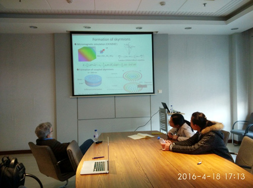 訪問期間,Stefan Bl gel教授還應(yīng)邀作了題為“Topologically protected Spin Textures at Metal Surfaces”的seminar報(bào)告,并與磁性材料與磁學(xué)研究部的科研人員進(jìn)行了深入交流。就金屬磁性材料中的新型自旋織構(gòu)斯格米子的自發(fā)與外場(chǎng)驅(qū)動(dòng)呈現(xiàn),和楊騰副研究員、代瑩瑩助理研究員和博士研究生董寶娟等進(jìn)行了熱烈的討論;并就該類體系中廣為存在的非共線磁矩間的Dzyaloshinskii-Moriya(DM)相互作用的自旋-軌道耦合的物理根源,從相對(duì)論狄拉克方程出發(fā),進(jìn)行了細(xì)致的推演。Bl gel教授訪問期間還參觀了磁性材料與磁學(xué)研究部、公共技術(shù)服務(wù)部和先進(jìn)炭材料研究部的部分實(shí)驗(yàn)室。
