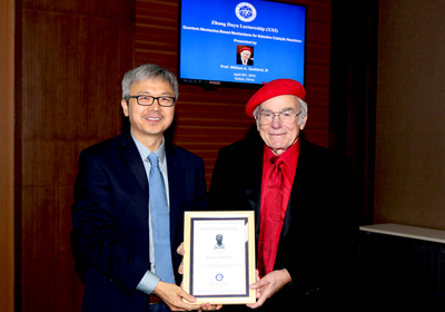 近日,國際著名理論化學家、美國科學院院士、美國國際量子分子科學院院士、美國加州理工學院材料與過程模擬中心主任William A.Goddard III教授應張大煜講座邀請,在中國科學院大連化學物理研究所能源基礎樓一樓會議室做了題為“Quantum Mechanics based mechanisms for selective catalytic reactions”的特邀報告。報告由鄧偉僑研究員主持,相關領域的科研人員和學生到場聽取了報告。副所長楊學明代表該所向Goddard頒發(fā)了所榮譽研究員證書及張大煜講座證書。