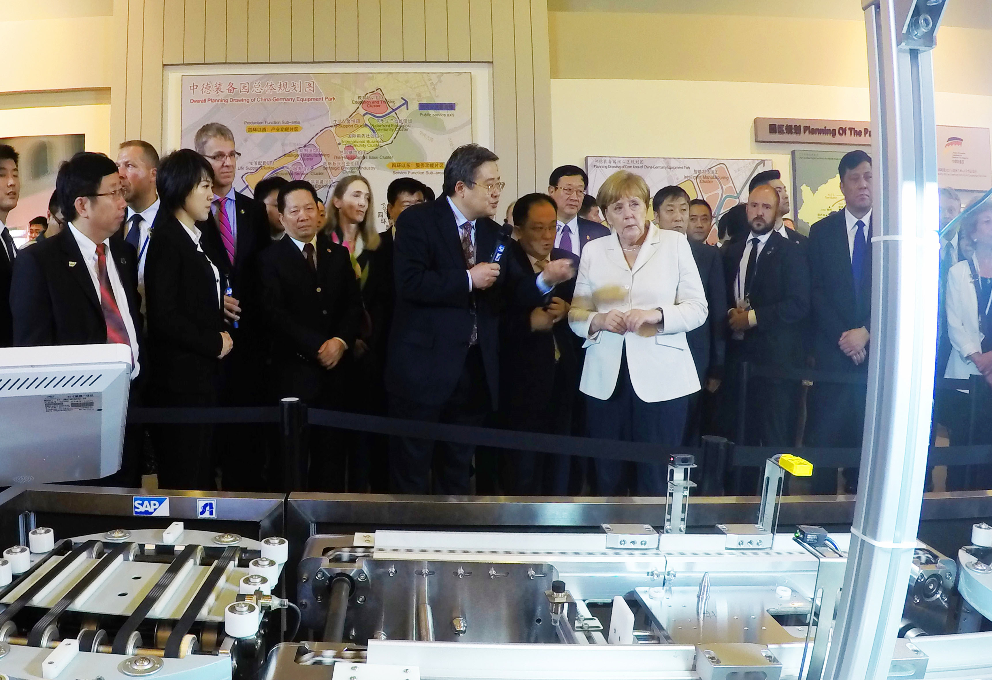 6月14日,德國總理默克爾在沈陽期間實(shí)地參觀了中國科學(xué)院沈陽自動化研究所與德國SAP公司合作研發(fā)的工業(yè)4.0示范生產(chǎn)線,并對生產(chǎn)線表現(xiàn)出極大的興趣。沈陽自動化所所長于海斌向默克爾總理詳細(xì)介紹了這條中國國內(nèi)首條工業(yè)4.0示范線。