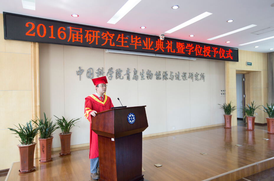 6月16日上午,中國科學(xué)院青島生物能源與過程研究所2016年度“緣聚青能所,共筑清源夢”研究生畢業(yè)典禮暨學(xué)位授予儀式隆重舉行。研究所學(xué)位委員會副主席、副所長彭輝,學(xué)位委員會副主席、副所長呂雪峰等出席活動。全體研究生及畢業(yè)生家屬代表參加了此次活動。