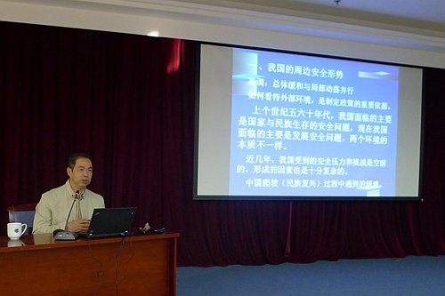 李福坤教授結(jié)合國內(nèi)和國際形勢,對我國的周邊安全形勢進(jìn)行了全面介紹,強(qiáng)調(diào)海洋對我國發(fā)展的戰(zhàn)略意義,并圍繞南海局勢、釣魚島問題的基本立場和應(yīng)對策略進(jìn)行了透徹解讀。李教授還詳細(xì)分析了中美、中日關(guān)系的現(xiàn)狀和發(fā)展趨勢,并就中國的軍事力量與其他國家的軍事力量進(jìn)行了系統(tǒng)剖析。他指出,面對錯綜復(fù)雜的國際形勢,關(guān)鍵要做好自己的事情,不斷增強(qiáng)國家綜合實(shí)力,妥善處理與周邊國家的關(guān)系,構(gòu)建海洋發(fā)展戰(zhàn)略,加強(qiáng)國防建設(shè),總體布局,主動作為,最終實(shí)現(xiàn)維護(hù)我國國防安全穩(wěn)定目的,為建設(shè)社會主義現(xiàn)代化強(qiáng)國奠定基礎(chǔ)。通過新鮮恰當(dāng)?shù)淖糇C事例、發(fā)人深思的時事觀點(diǎn)、風(fēng)趣幽默的授課方式,李教授贏得了參會人員的陣陣掌聲。